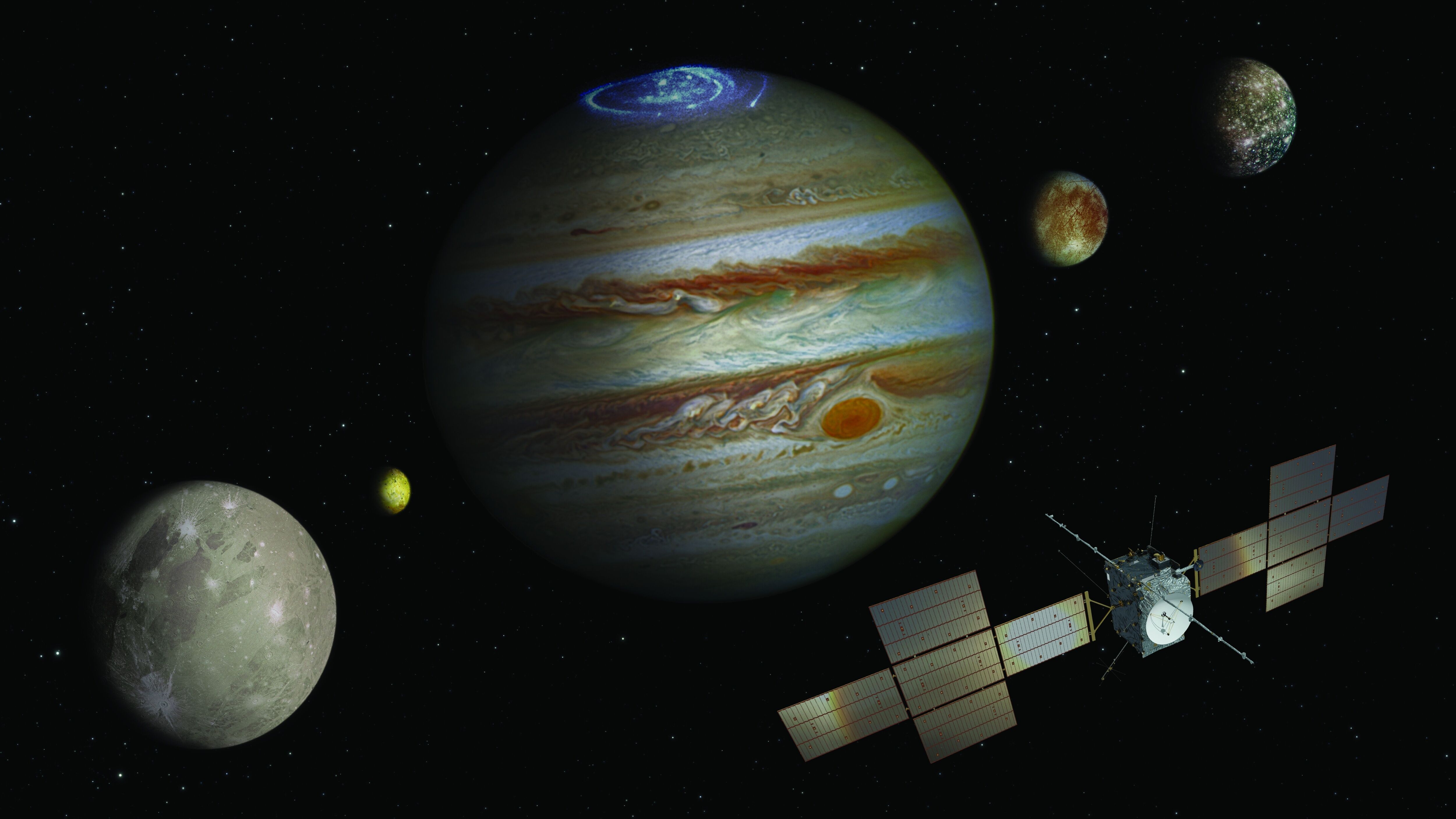 Note: This graphic was updated in July 2022. It may still be some years away from launch, and over a decade before our Jupiter Icy Moons Explorer reaches the gas giant and its icy moons, but preparations are well under way. This new artist’s impression depicts the final spacecraft design, the construction of which is being overseen by Airbus Defence and Space. The spacecraft’s solar wings form a distinctive cross-shape totalling 97 sq m, the largest ever flown on an interplanetary mission. The size is essential to generate sufficient power – around 850 W – for the instruments and spacecraft so far from the Sun. The spacecraft is furnished with a laboratory of instruments that will investigate Jupiter’s turbulent atmosphere and vast magnetosphere, as well as study the planet-sized moons Ganymede, Europa and Callisto. All three moons are thought to have oceans of liquid water beneath their icy crusts and should provide key clues on the potential for such moons to harbour habitable environments. Juice’s cameras will capture exquisite details of the moon’s features, as well as identify the ices and minerals on their surfaces. Other instruments will sound the subsurface and interior of the moons to better understand the location and nature of their buried oceans. The tenuous atmosphere around the moons will also be explored. The spacecraft will also include booms such as a 10 m-long magnetometer mast (seen towards the bottom of Juice in the artist impression), a 16 m radar antenna (the long boom across the top), and antennas to measure electric and magnetic fields. Ganymede is the only moon in the Solar System to generate its own internal magnetic field, and Juice is well equipped to document its behaviour and explore its interaction with Jupiter’s own magnetosphere. Juice is scheduled for launch in 2022 on a seven-year journey to the Jovian system. Its tour will include a dedicated orbit phase of Jupiter, targeted flybys of Europa, Ganymede and Callisto, and finally nine months orbiting Ganymede – the first time any moon beyond our own has been orbited by a spacecraft. In the artist’s impression, which is not to scale, Ganymede is shown in the foreground, Callisto to the far right, and Europa centre-right. Volcanically active moon Io is also shown, at left. The moons were imaged by NASA’s Galileo spacecraft; Jupiter is seen here with a vivid aurora, captured by the NASA/ESA Hubble Space Telescope.