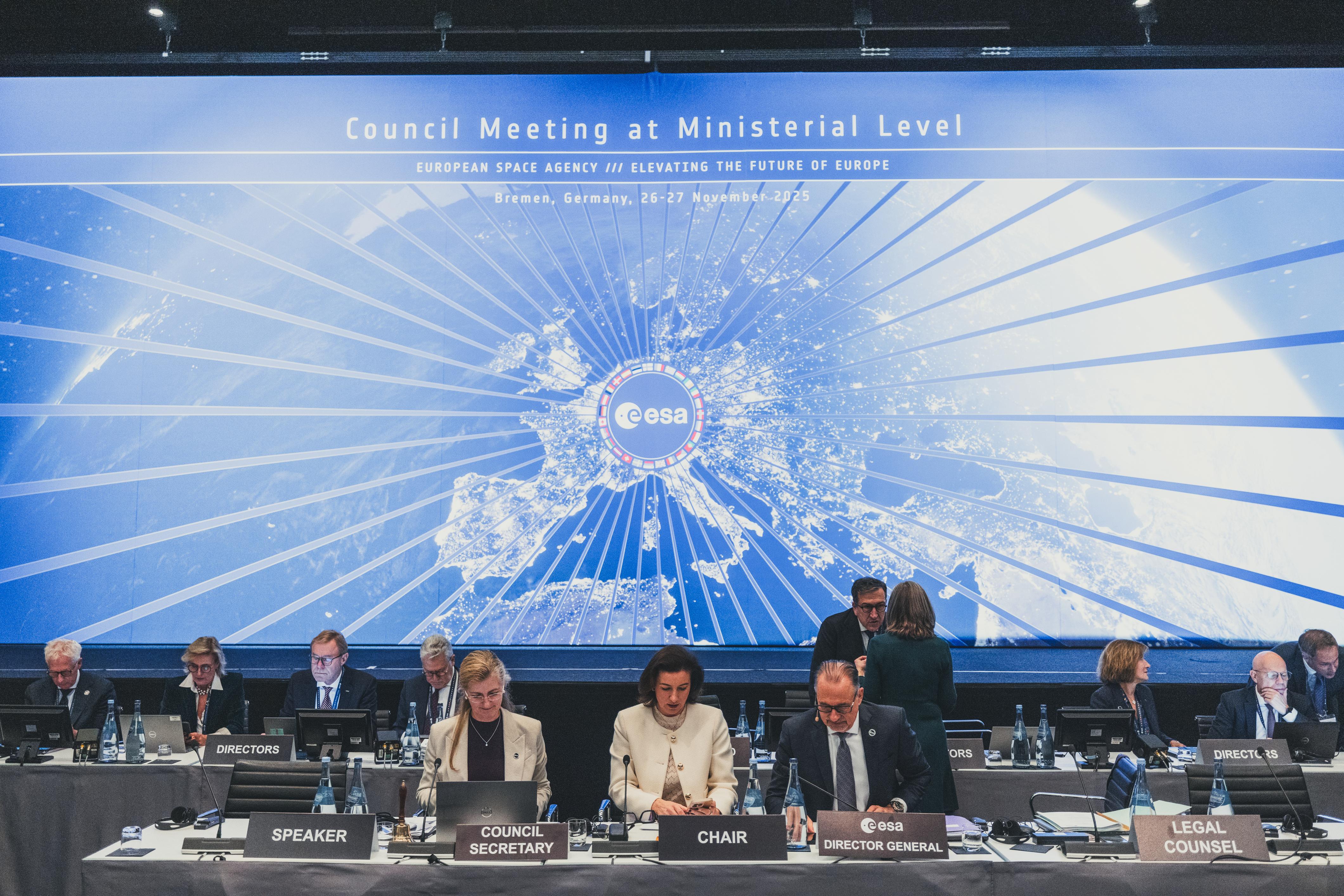 The Opening Session at the 2025 Ministerial Council in Bremen, Germany on 26 November 2025. Dorothee Bär, Federal Minister of Research, Technology and Space, Germany, opened the meeting. Adolfo Urso, Minister of Business and Made in Italy was elected Chair of CM25, the ESA Council at Ministerial level.