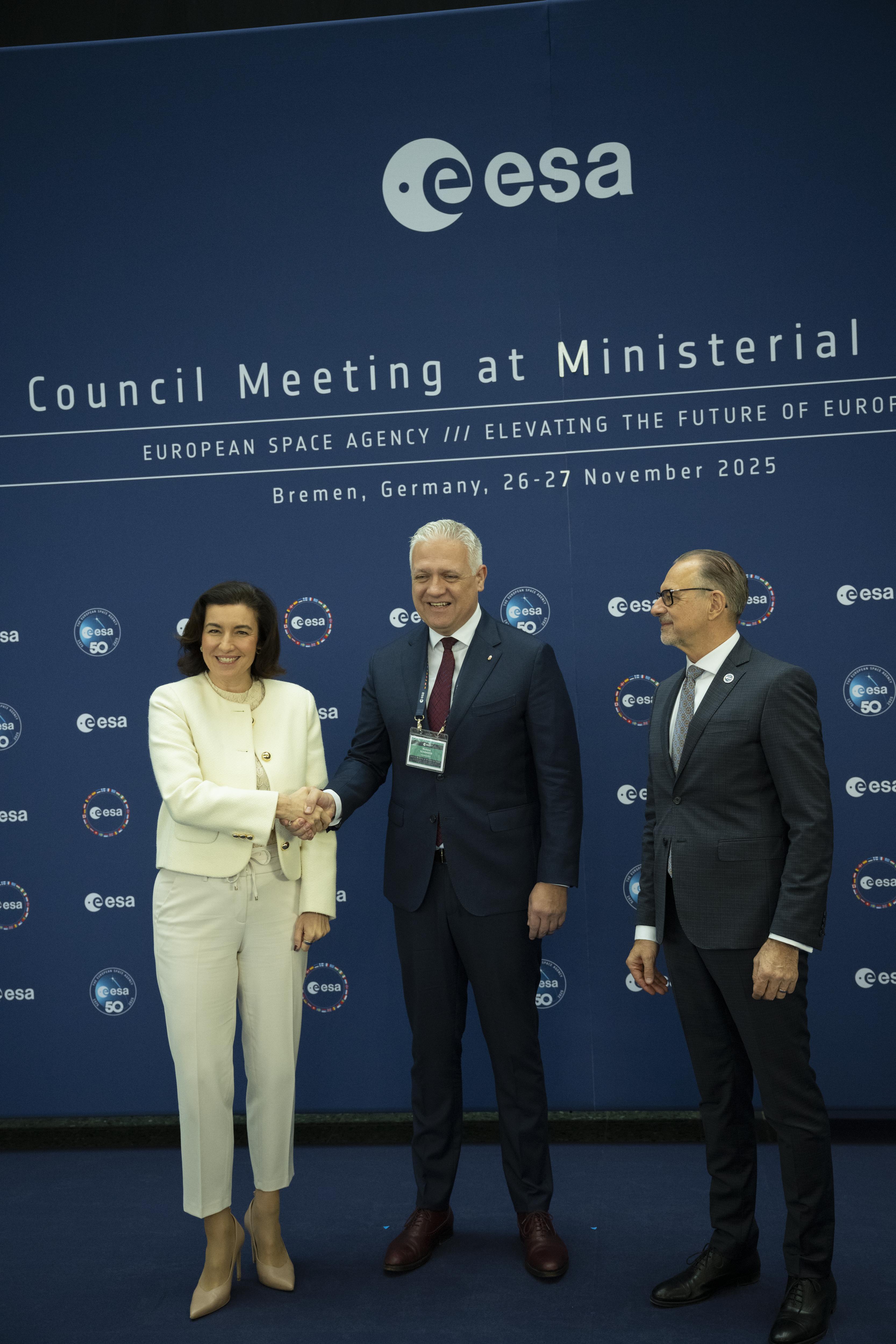 Arrival and greeting of Ministers and photos with ESA astronauts at the start of day 2 of the 2025 Ministerial Council in Bremen, Germany on 26 November 2025.