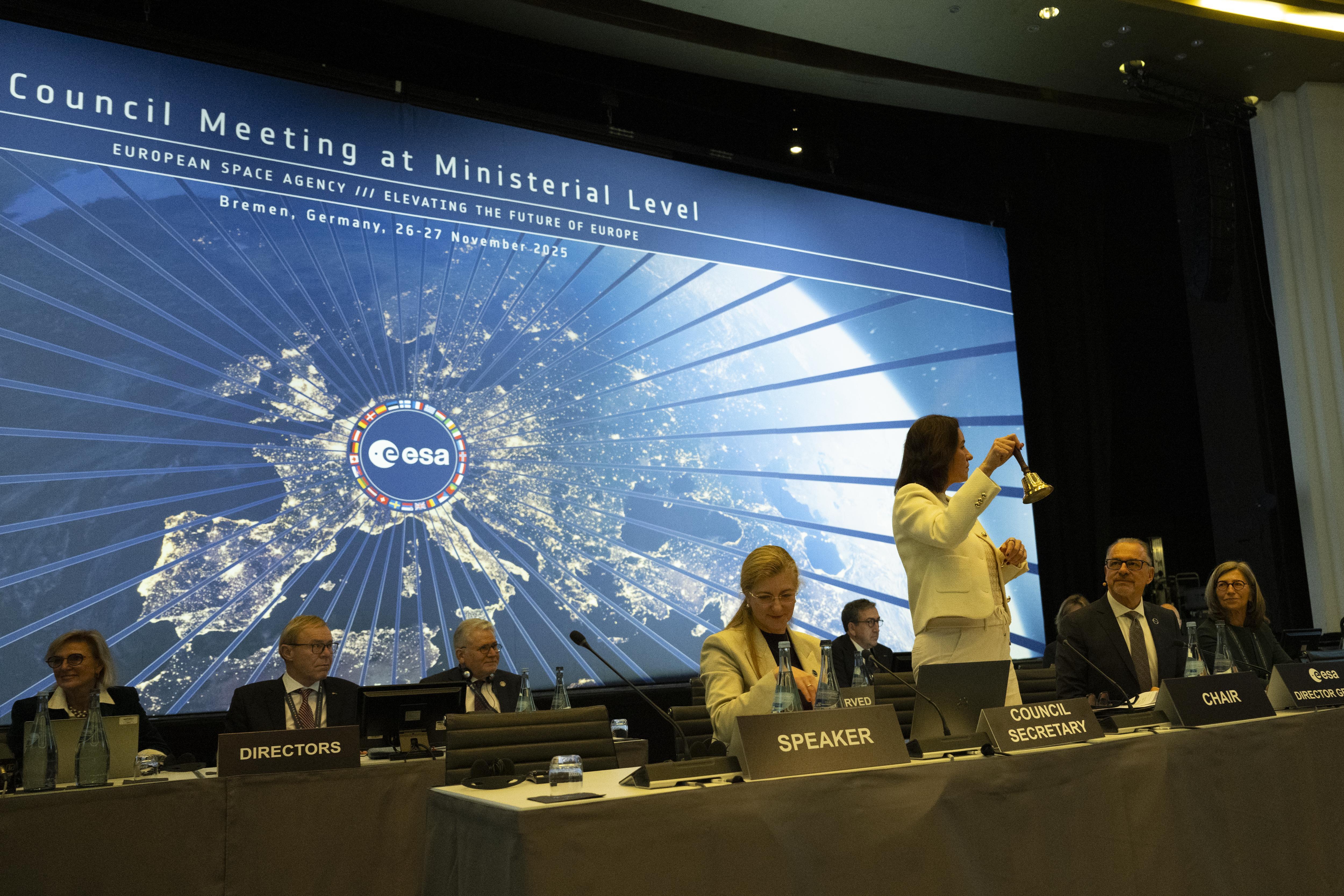 The Opening Session at the 2025 Ministerial Council in Bremen, Germany on 26 November 2025. Dorothee Bär, Federal Minister of Research, Technology and Space, Germany, opened the meeting. Adolfo Urso, Minister of Business and Made in Italy was elected Chair of CM25, the ESA Council at Ministerial level.