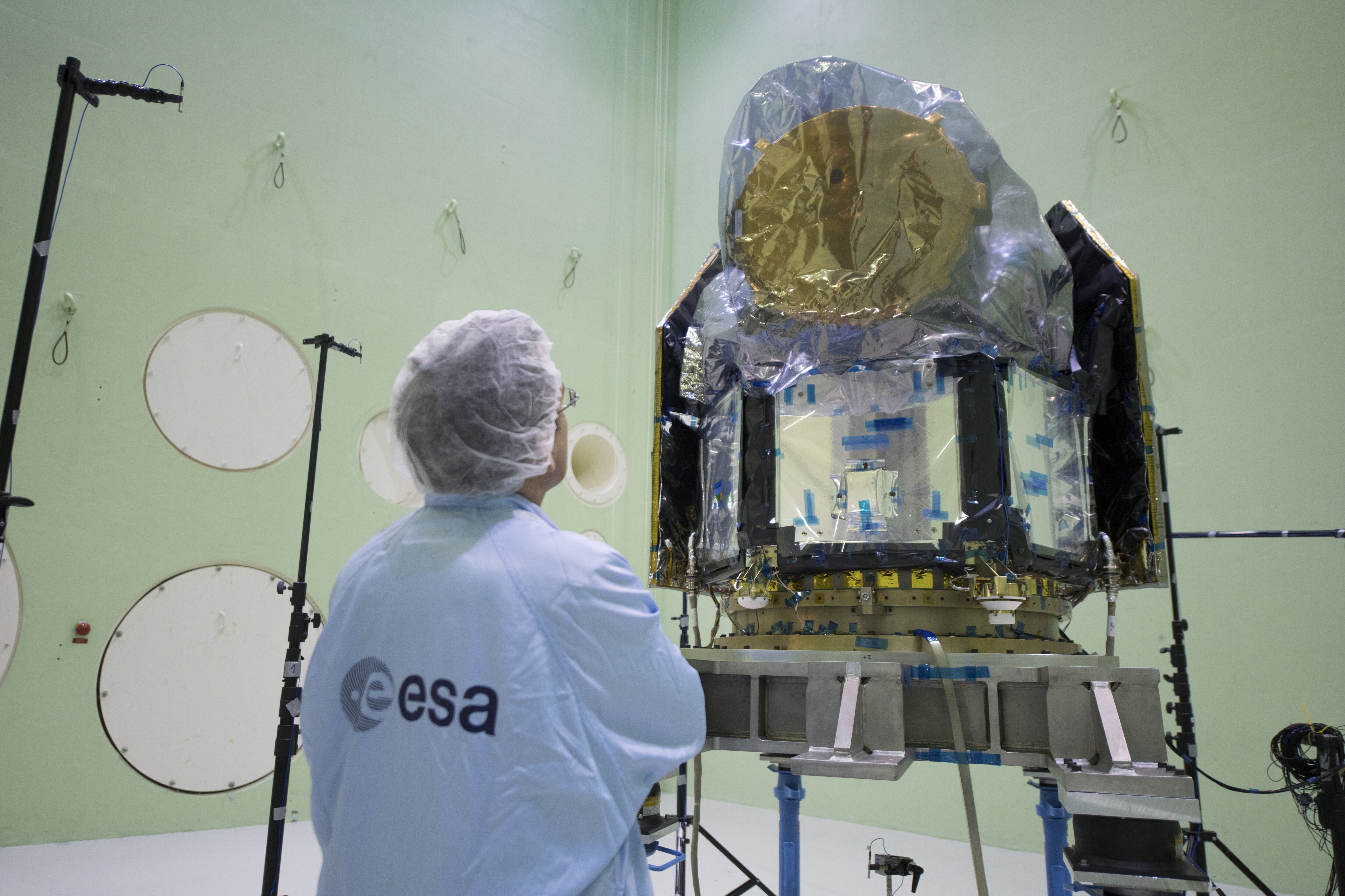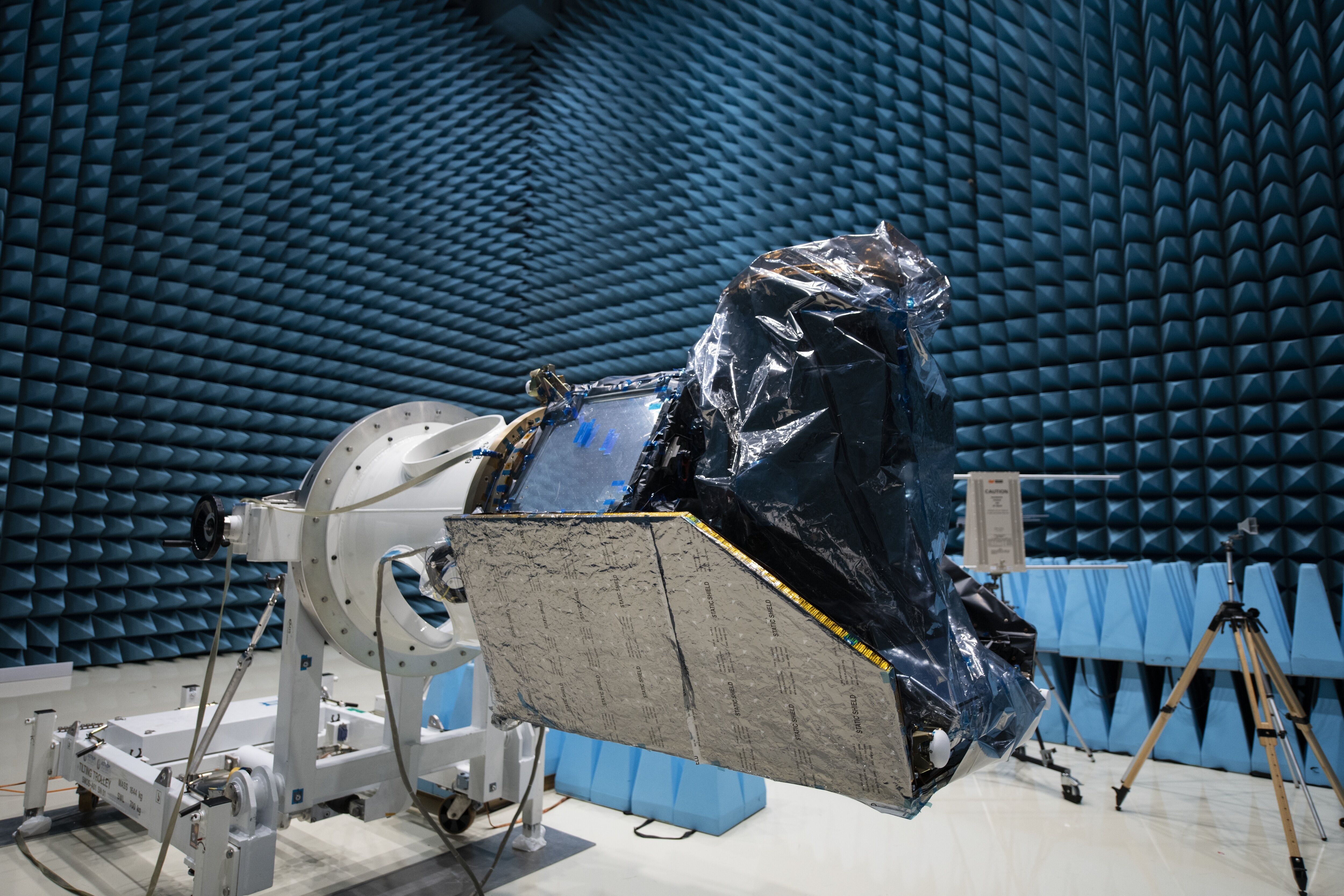 The CHEOPS (CHaracterising ExOPlanet) spacecraft in the MAXWELL electromagnetic test chamber at ESA's European Space Research and Technology Centre (ESTEC) in Noordwijk, the Netherlands, on 7 September, 2018. The CHEOPS spacecraft is currently undergoing a series of electromagnetic compatibility testing. It is essential to ensure that the electrical and electronic equipment within a spacecraft function correctly. When switching on an experiment for example, if other payload systems, such as the telemetry or other telecommunications links, were disturbed or even disrupted, there could be serious consequences. CHEOPS will be the first mission dedicated to searching for exoplanetary transits by performing ultrahigh precision photometry on bright stars already known to host planets.