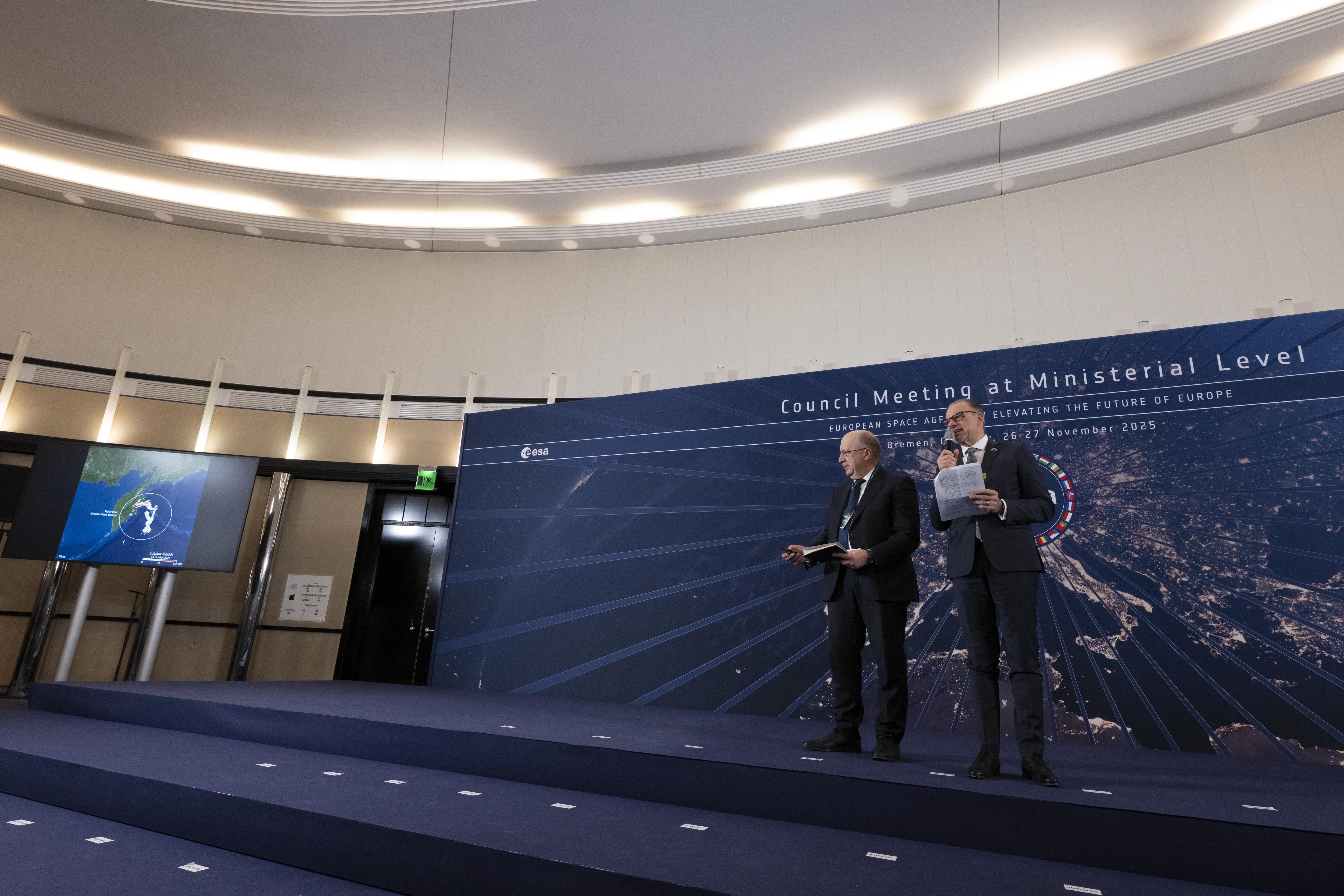The Opening Session at the 2025 Ministerial Council in Bremen, Germany on 26 November 2025. Dorothee Bär, Federal Minister of Research, Technology and Space, Germany, opened the meeting. Adolfo Urso, Minister of Business and Made in Italy was elected Chair of CM25, the ESA Council at Ministerial level.