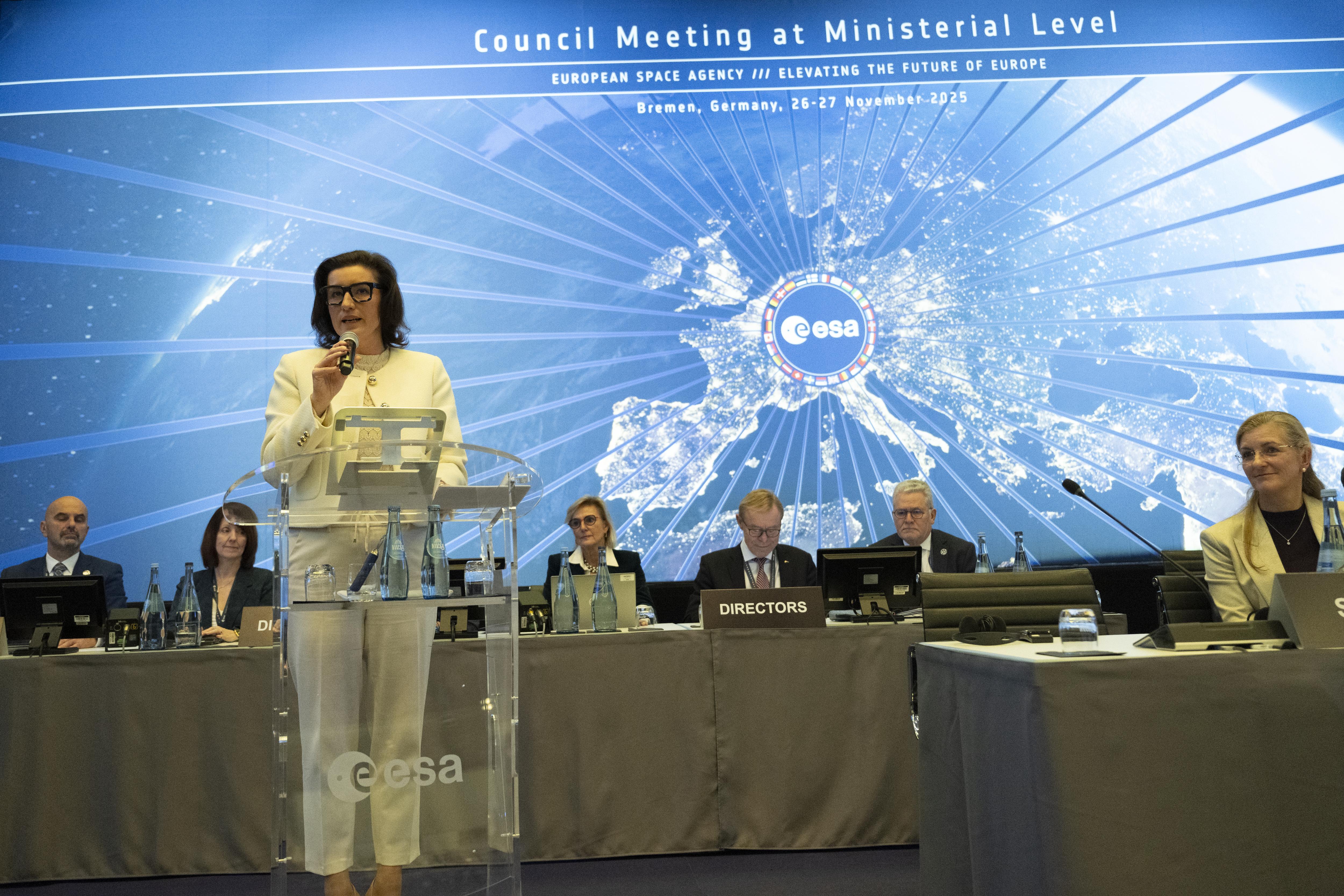 The Opening Session at the 2025 Ministerial Council in Bremen, Germany on 26 November 2025. Dorothee Bär, Federal Minister of Research, Technology and Space, Germany, opened the meeting. Adolfo Urso, Minister of Business and Made in Italy was elected Chair of CM25, the ESA Council at Ministerial level.