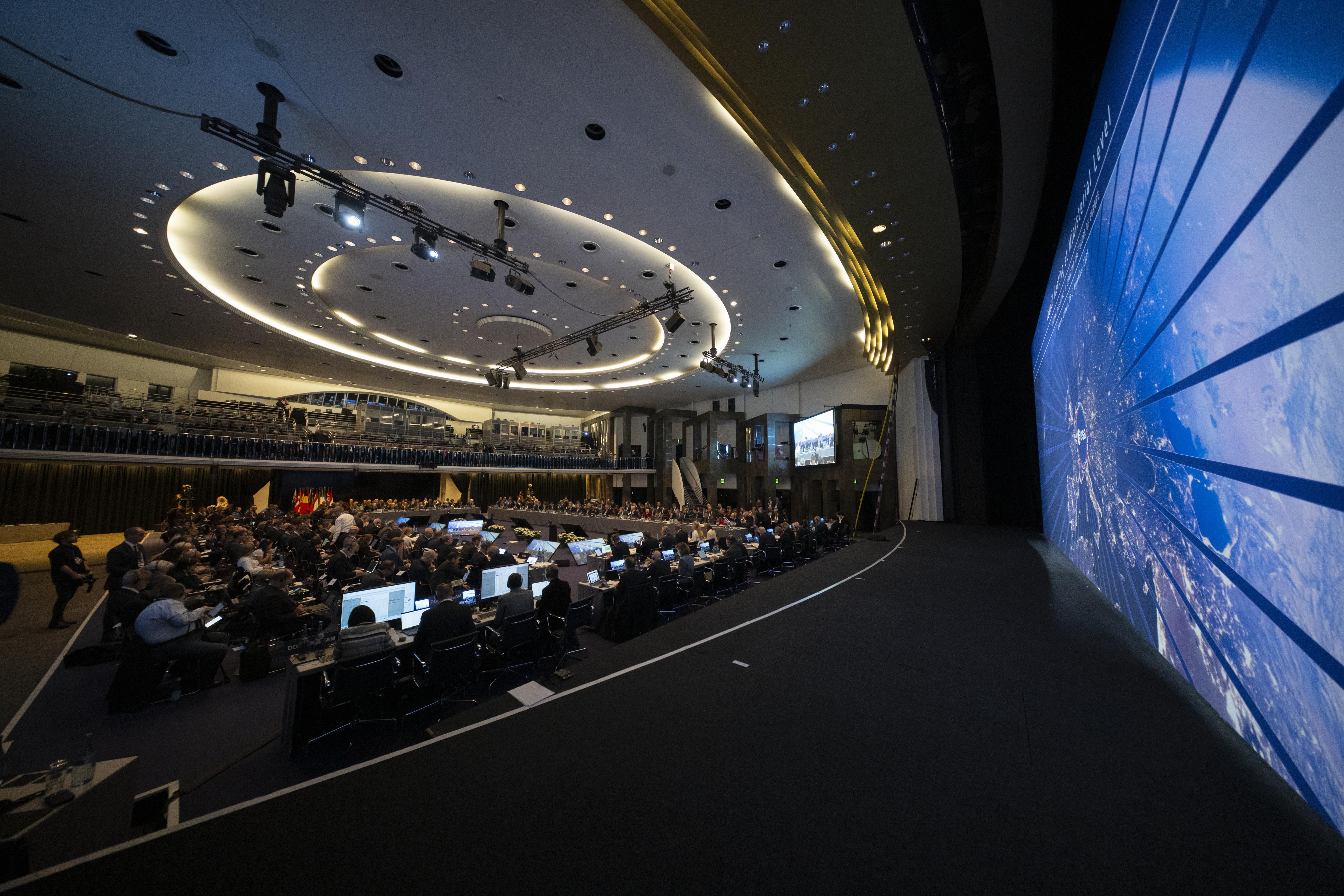 Wide angle shots of the conference room at the 2025 Ministerial Council in Bremen, Germany on 27 November 2025.