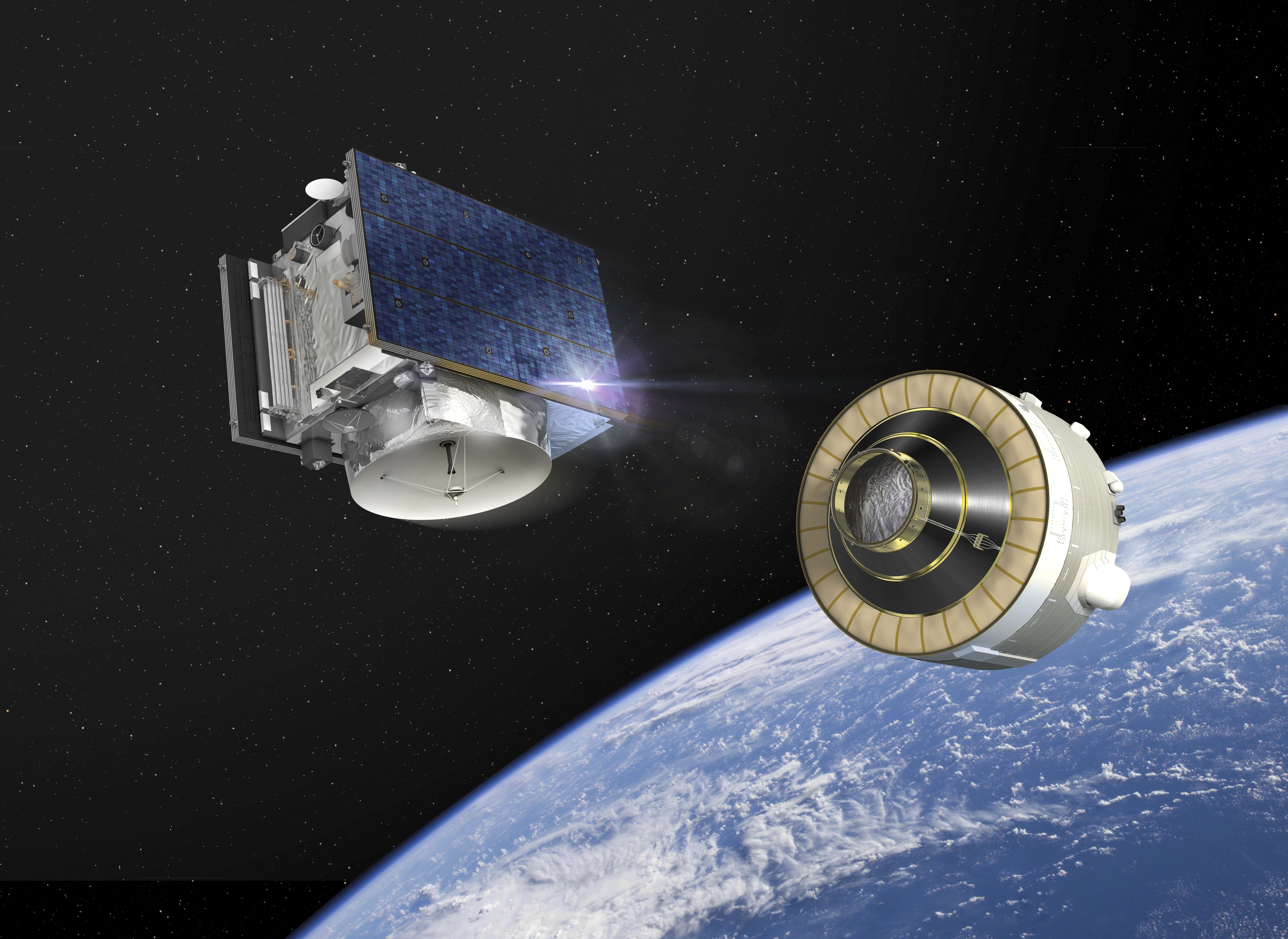 Artist's impression showing the ATV-5 approaching the International Space Station (ISS). ESA’s fifth and last Automated Transfer Vehicle, Georges Lemaître, will deliver more than 2600 kg of dry cargo to the International Space Station; its launch is set for this summer on an Ariane 5 from Europe’s Spaceport in Kourou, French Guiana.