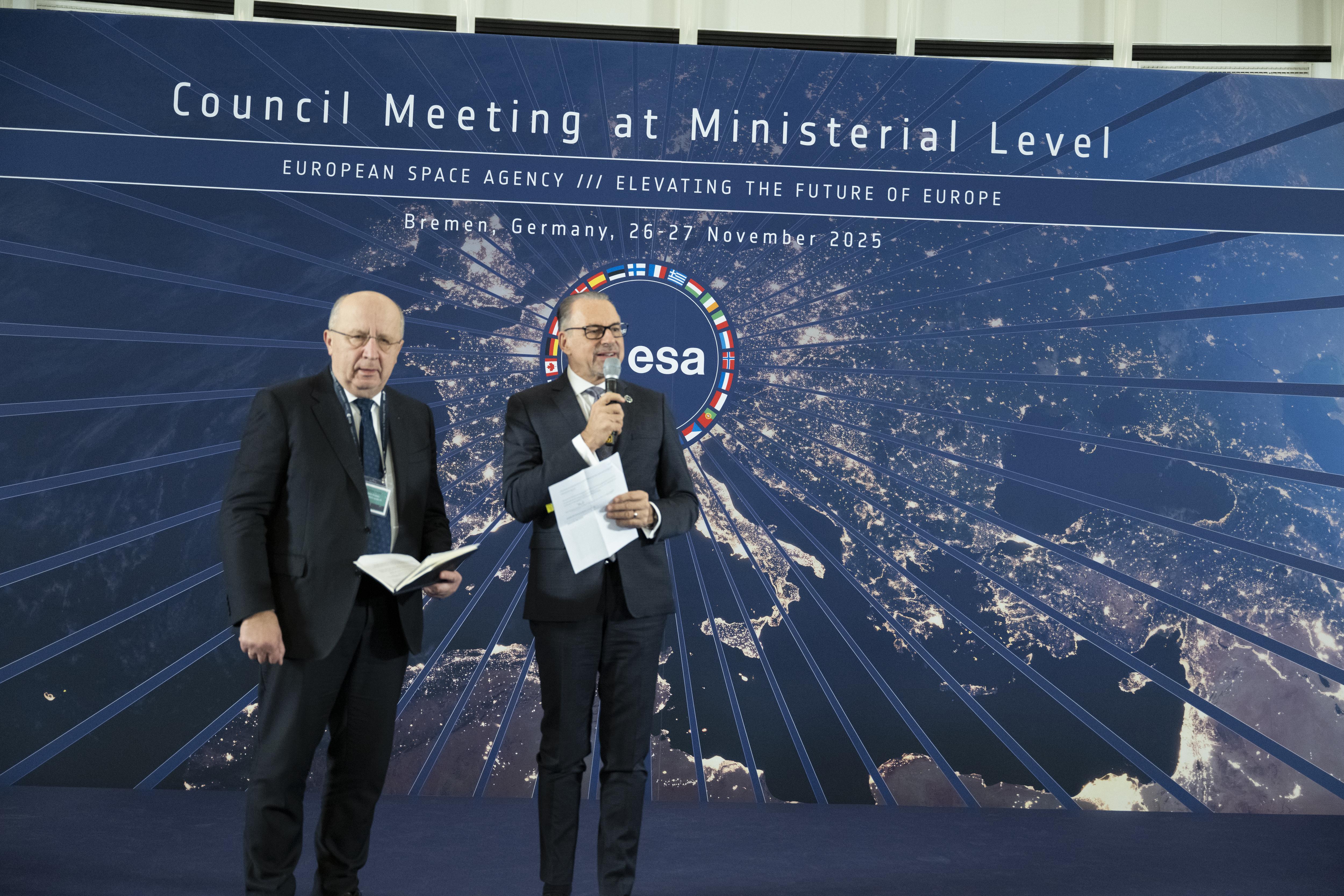 The Opening Session at the 2025 Ministerial Council in Bremen, Germany on 26 November 2025. Dorothee Bär, Federal Minister of Research, Technology and Space, Germany, opened the meeting. Adolfo Urso, Minister of Business and Made in Italy was elected Chair of CM25, the ESA Council at Ministerial level.