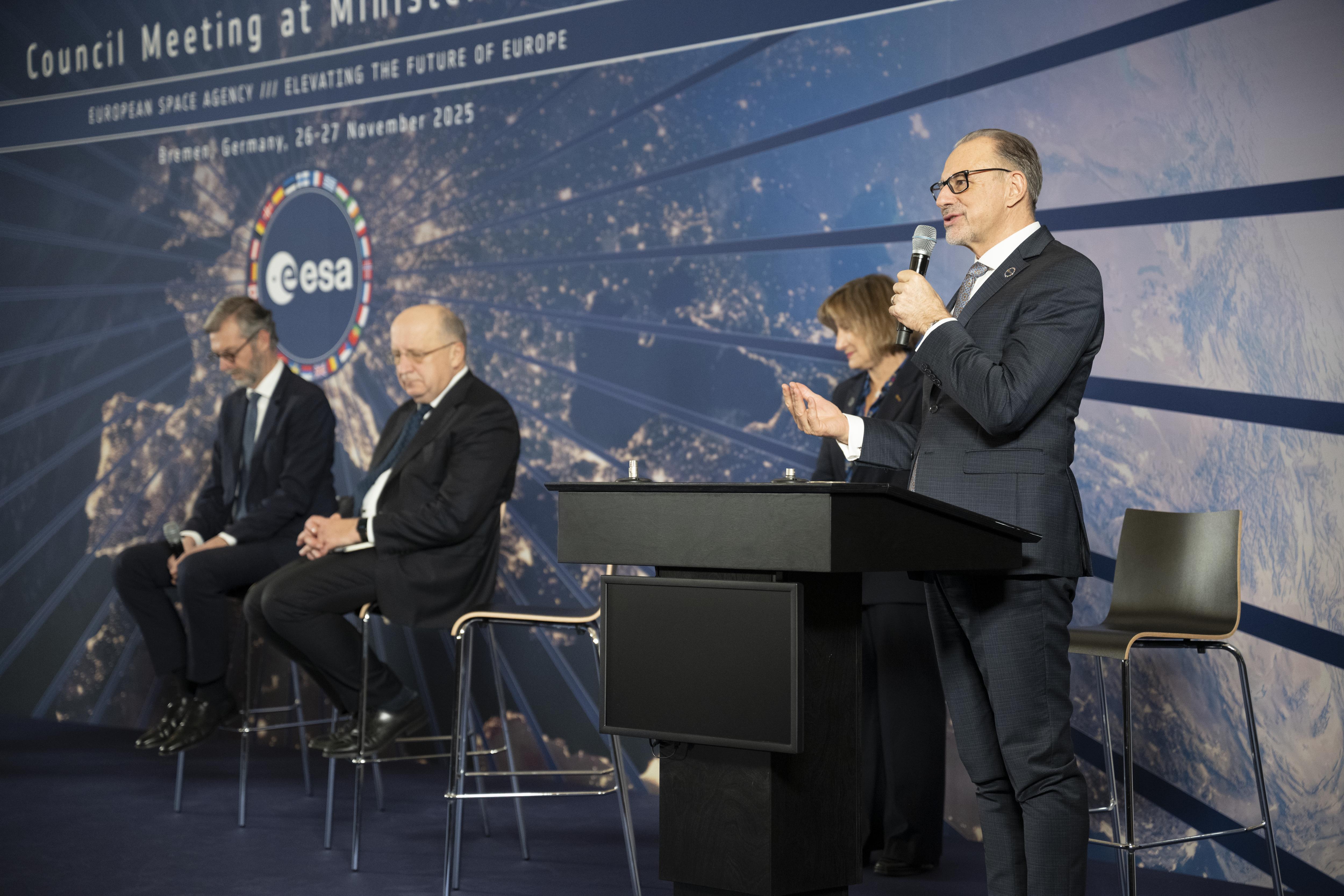 In the context of the ESA Ministerial, the European Investment Bank has announced plans for a space lending facility, which is designed to improve access to debt financing for space businesses at the small- to medium-enterprise or mid-cap (250-3000 employees) scale. EIB Vice President Robert de Groot presented the plan in the presence of European Commissioner Andrius Kubilius and ESA Director General Josef Aschbacher.