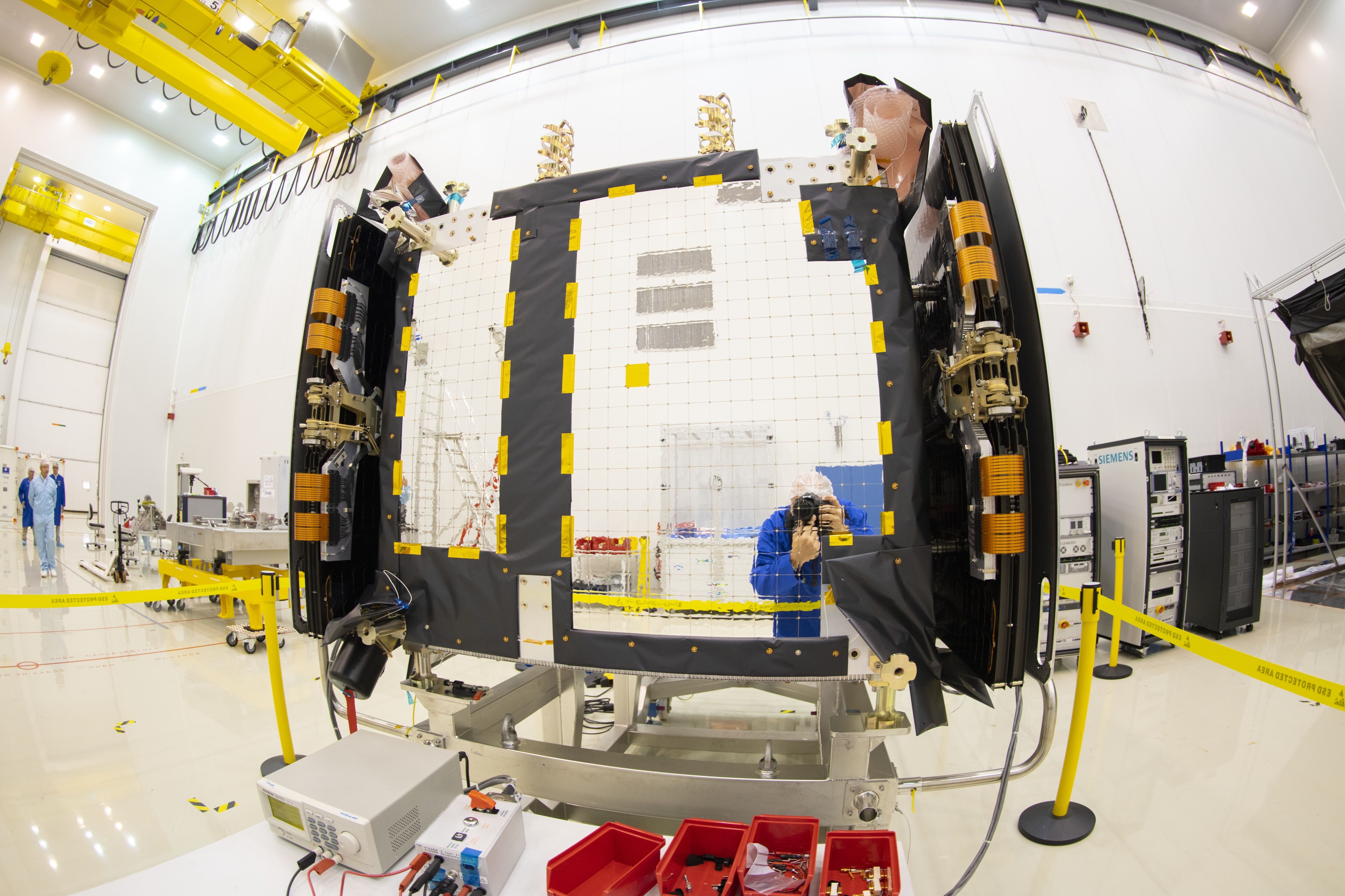 Galileo FM-22 Ellen in final preparations in building S1 before transfer for fueling. The four satellites are being placed into their protective containers to be transported from the S1A processing building to the S3B payload preparation building, where they will be filled with the hydrazine fuel that will keep the satellites manoeuverable during their 12-year working lives. Meanwhile the Ariane 5 for this launch – known as Flight VA244 – has undergone assembly inside the Spaceport’s Launcher Integration Building. The Galileo System began Initial Services on 15 December 2016, and more than 100 million devices are using Galileo today.