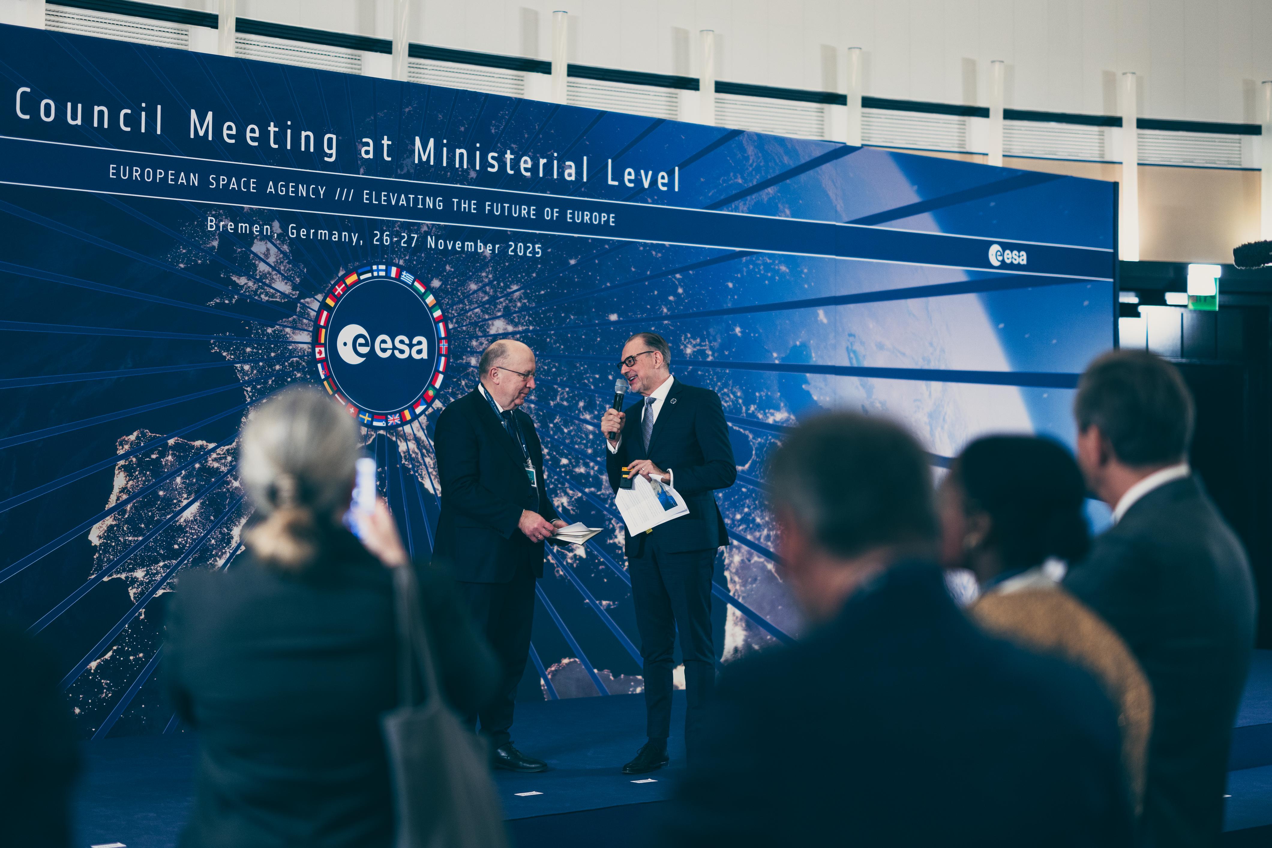 The Opening Session at the 2025 Ministerial Council in Bremen, Germany on 26 November 2025. Dorothee Bär, Federal Minister of Research, Technology and Space, Germany, opened the meeting. Adolfo Urso, Minister of Business and Made in Italy was elected Chair of CM25, the ESA Council at Ministerial level.