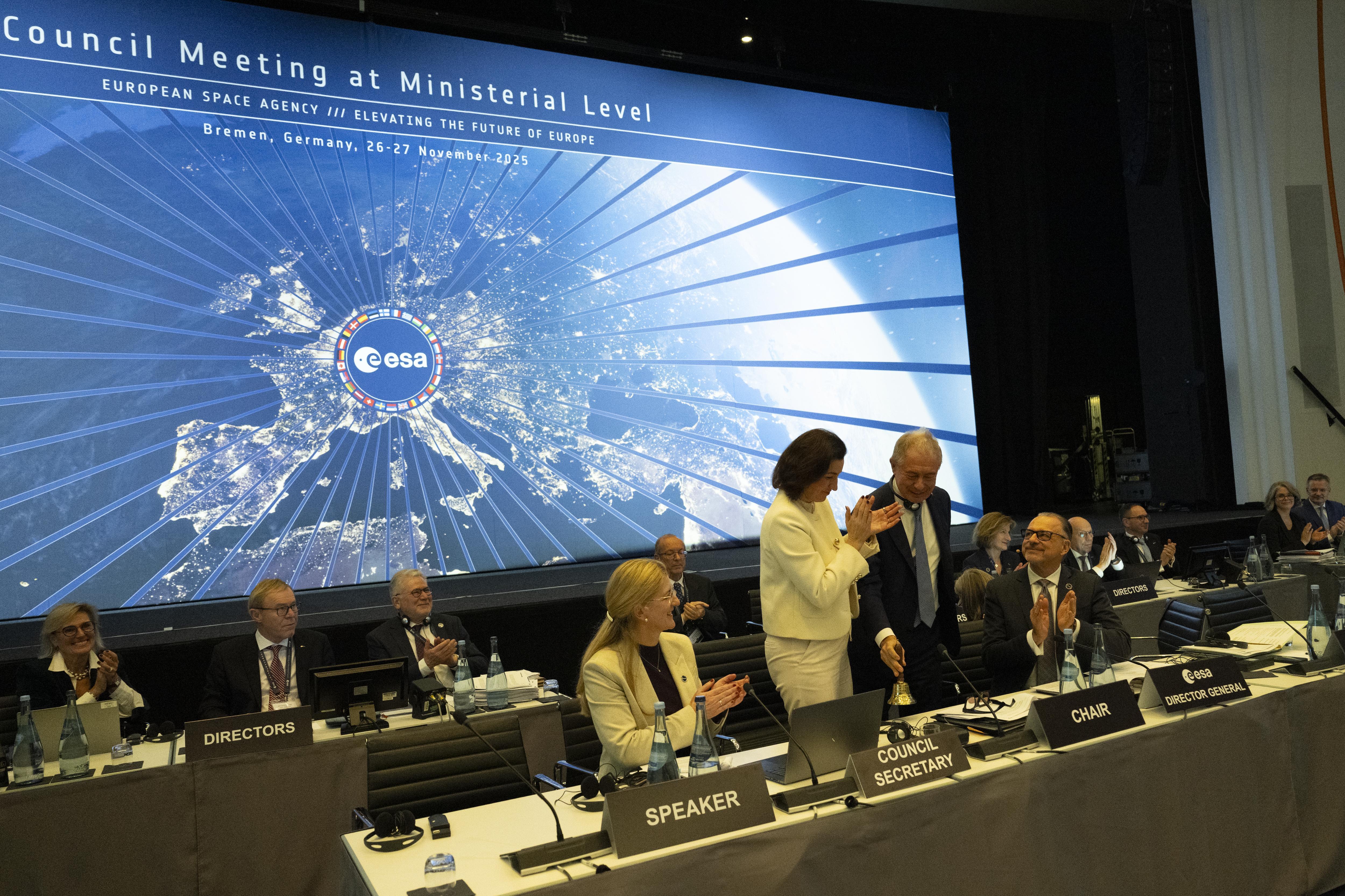 The Opening Session at the 2025 Ministerial Council in Bremen, Germany on 26 November 2025. Dorothee Bär, Federal Minister of Research, Technology and Space, Germany, opened the meeting. Adolfo Urso, Minister of Business and Made in Italy was elected Chair of CM25, the ESA Council at Ministerial level.