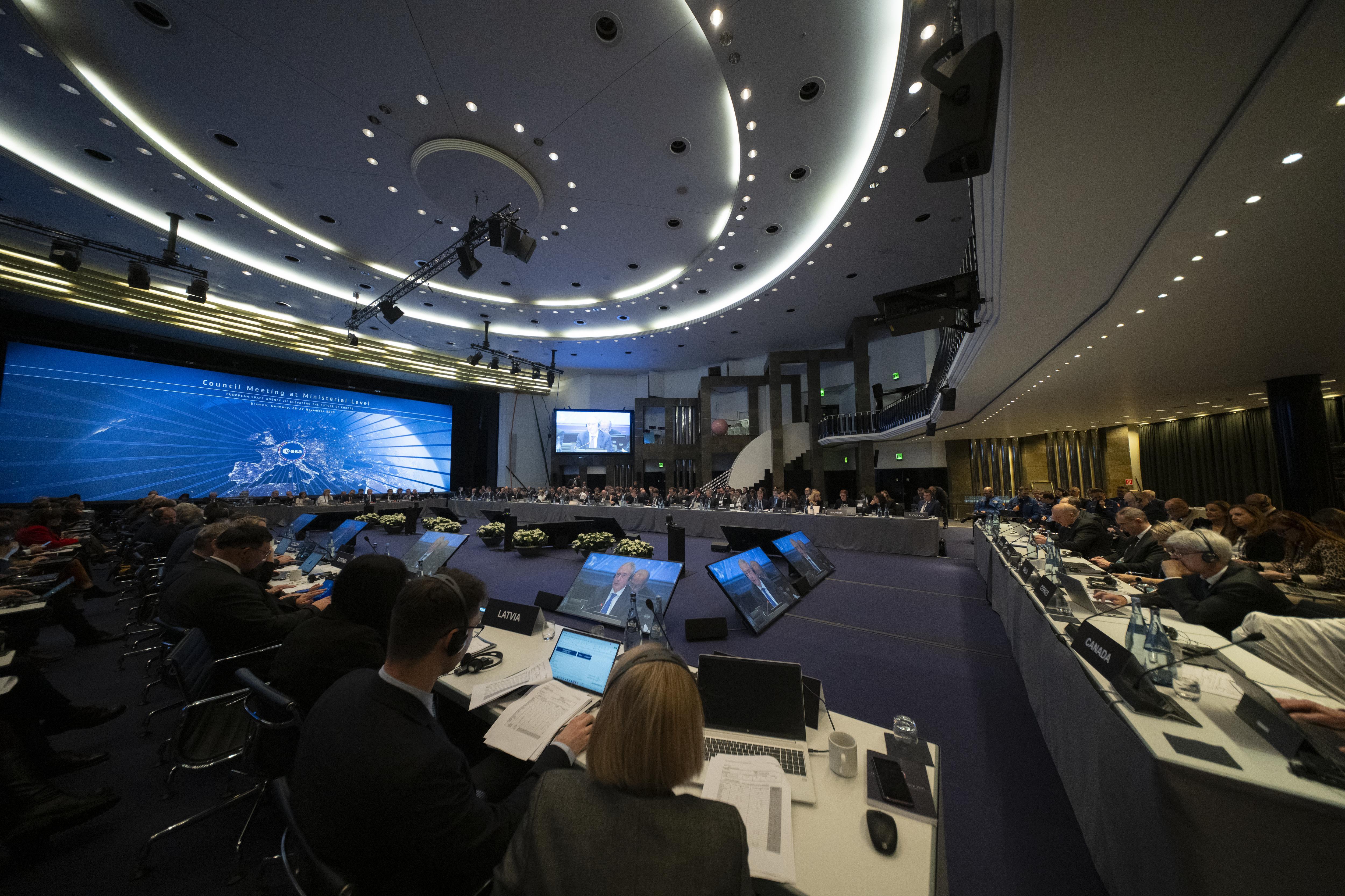 Wide angle shots of the conference room at the 2025 Ministerial Council in Bremen, Germany on 27 November 2025.