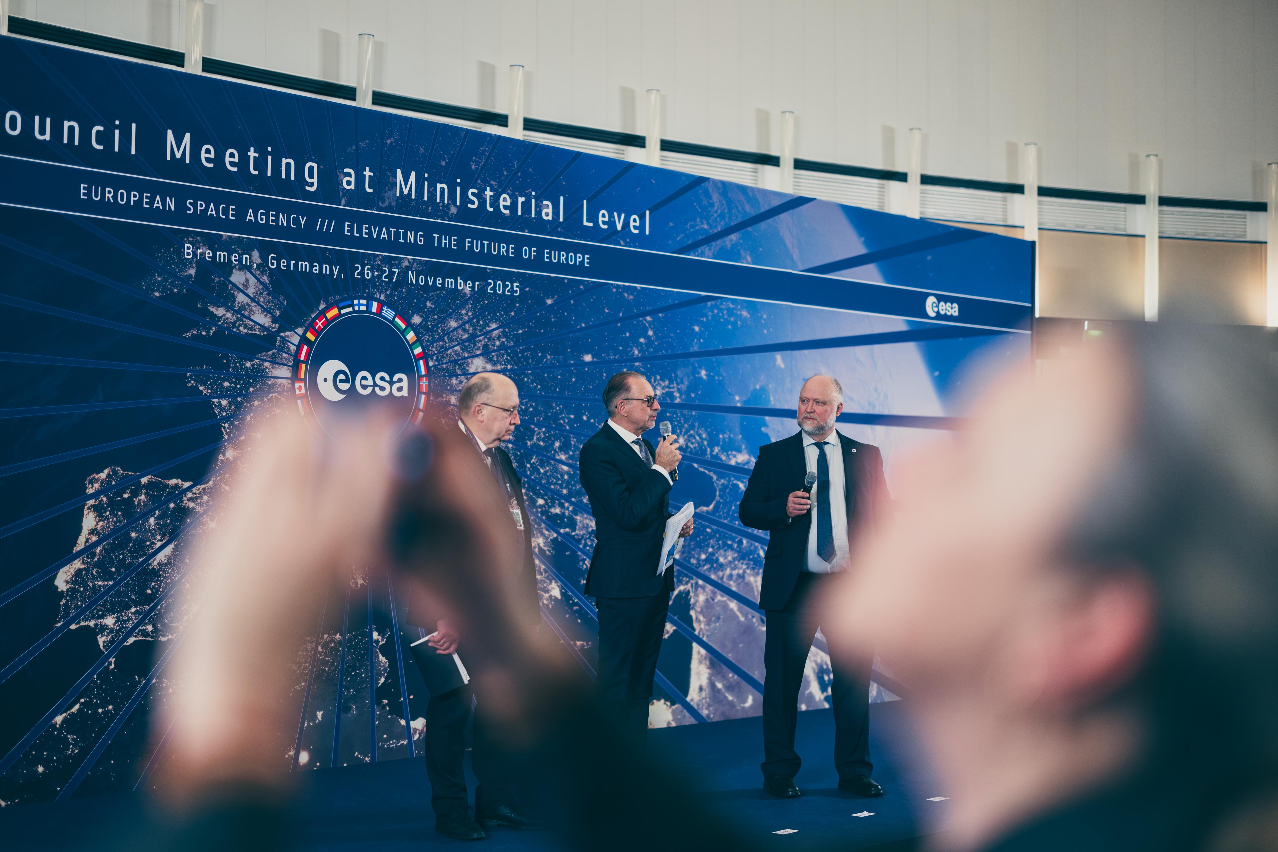The Opening Session at the 2025 Ministerial Council in Bremen, Germany on 26 November 2025. Dorothee Bär, Federal Minister of Research, Technology and Space, Germany, opened the meeting. Adolfo Urso, Minister of Business and Made in Italy was elected Chair of CM25, the ESA Council at Ministerial level.