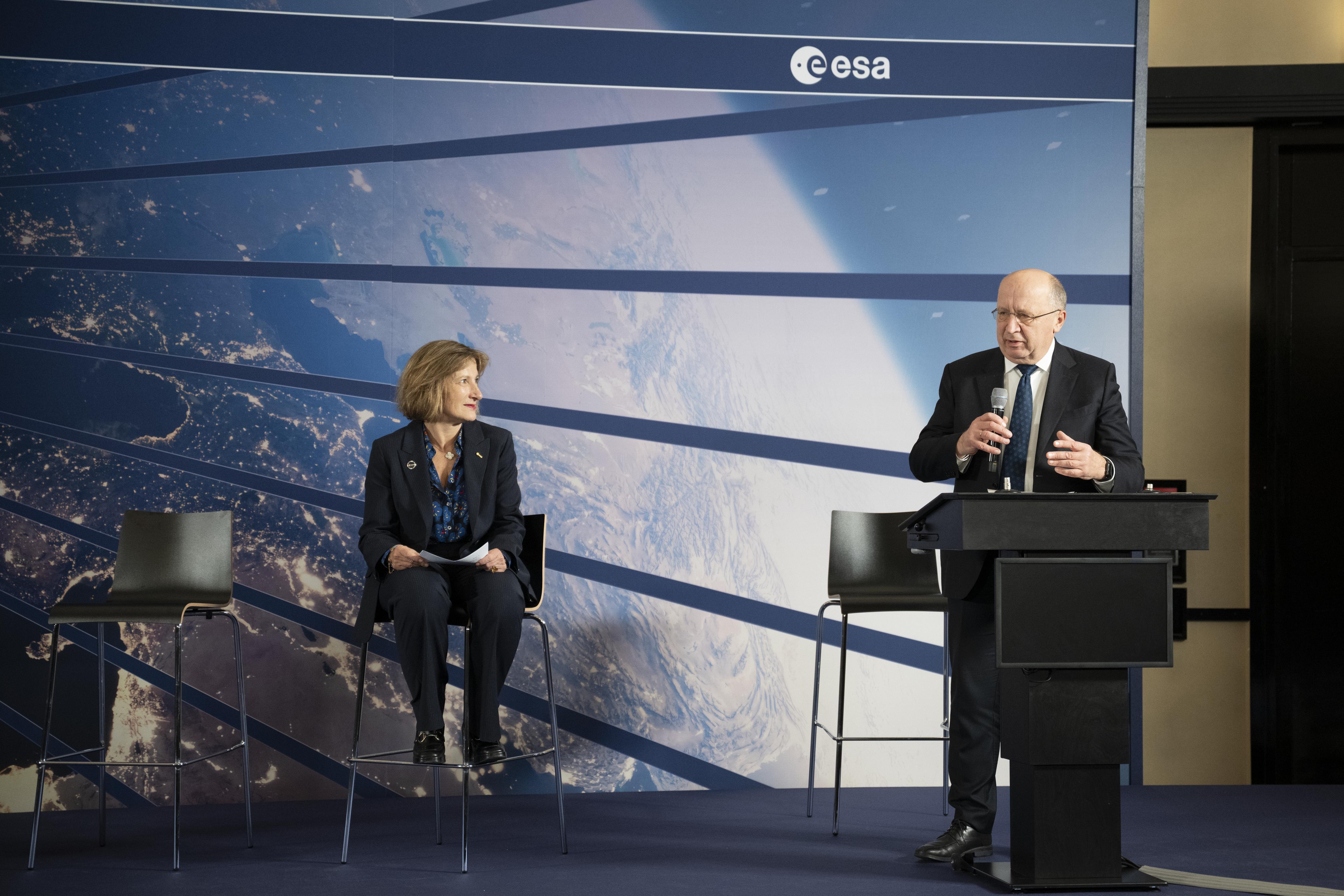 In the context of the ESA Ministerial, the European Investment Bank has announced plans for a space lending facility, which is designed to improve access to debt financing for space businesses at the small- to medium-enterprise or mid-cap (250-3000 employees) scale. EIB Vice President Robert de Groot presented the plan in the presence of European Commissioner Andrius Kubilius and ESA Director General Josef Aschbacher.