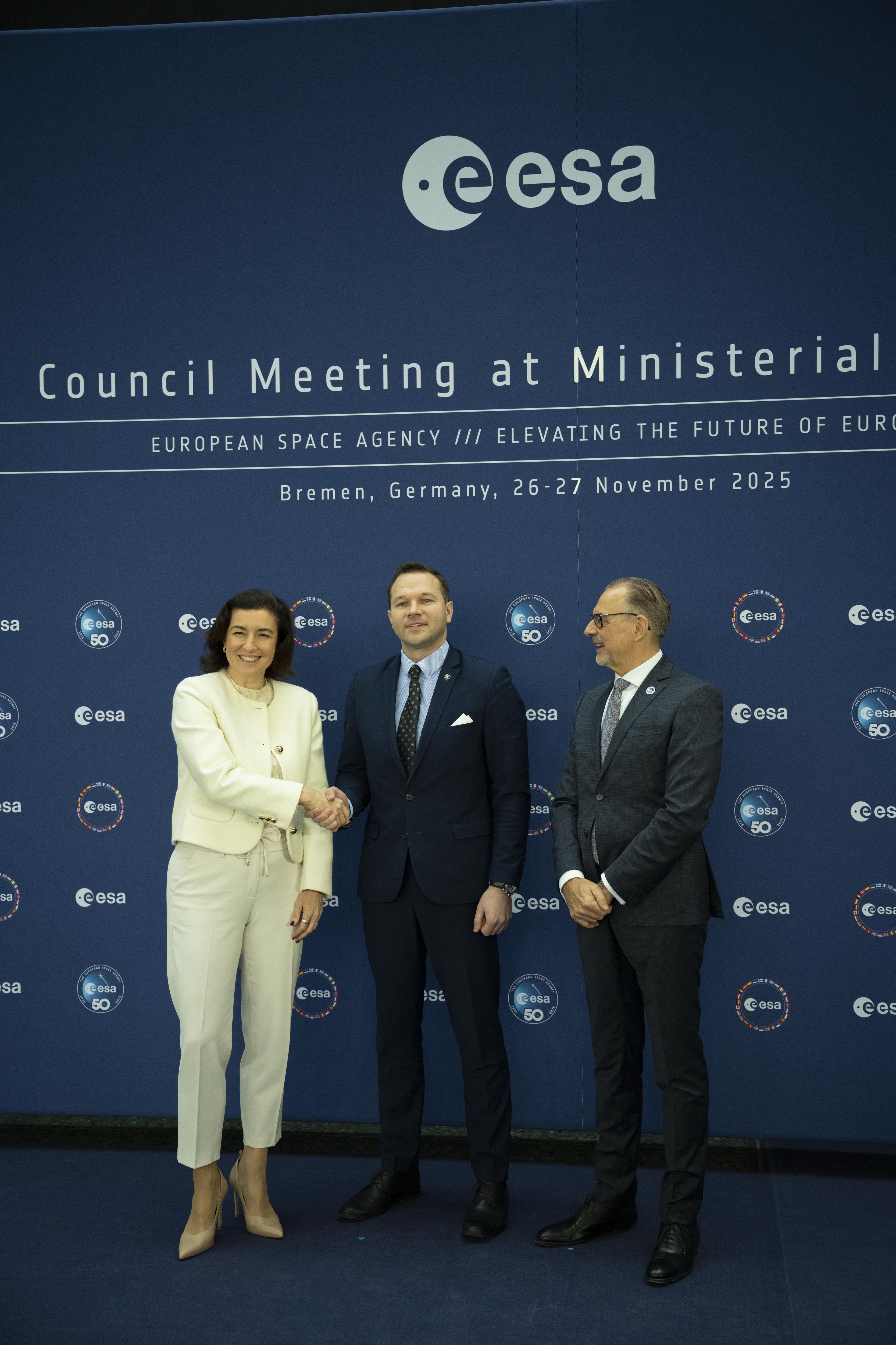 Arrival and greeting of Ministers and photos with ESA astronauts at the start of day 2 of the 2025 Ministerial Council in Bremen, Germany on 26 November 2025.