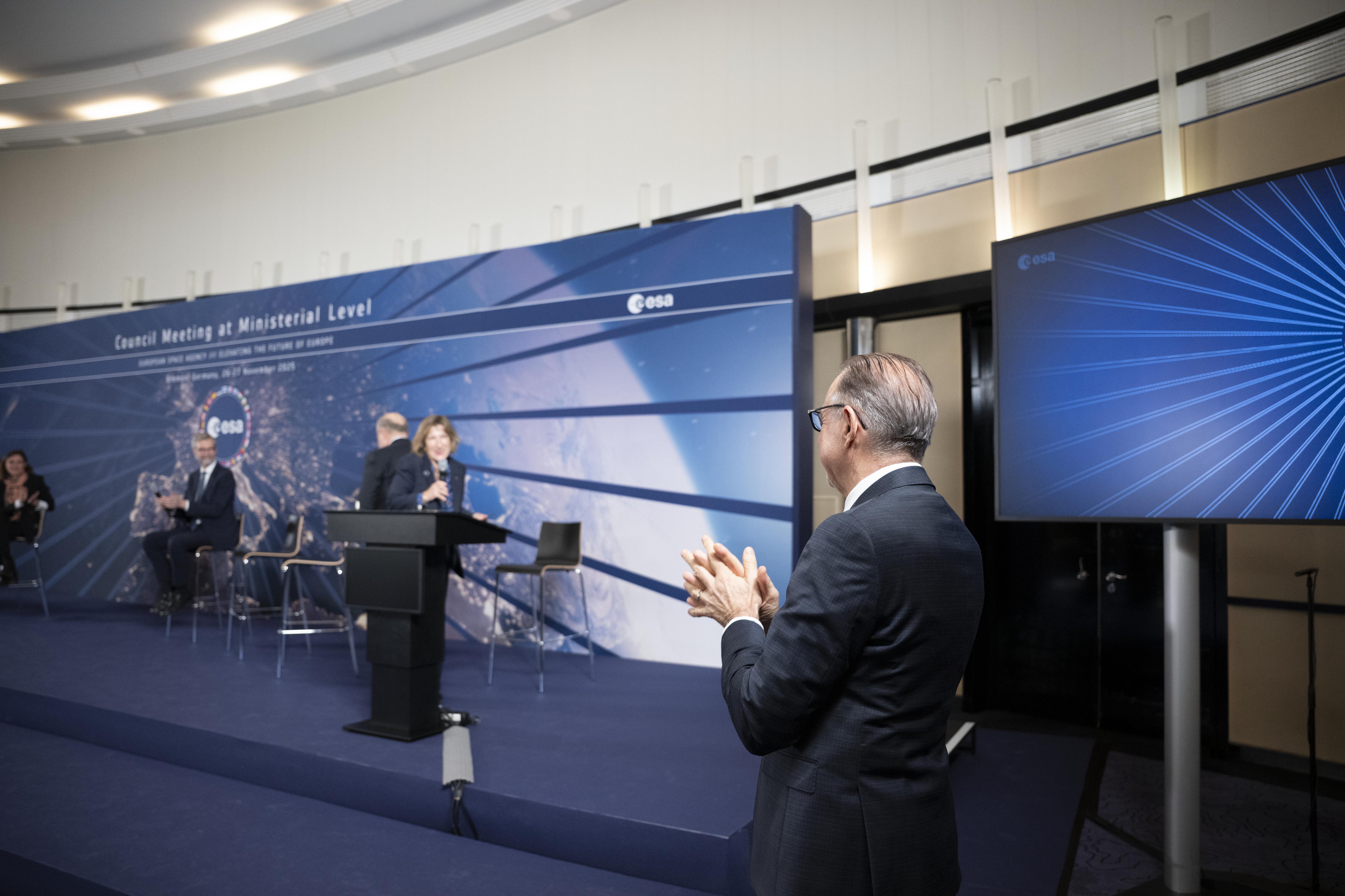 In the context of the ESA Ministerial, the European Investment Bank has announced plans for a space lending facility, which is designed to improve access to debt financing for space businesses at the small- to medium-enterprise or mid-cap (250-3000 employees) scale. EIB Vice President Robert de Groot presented the plan in the presence of European Commissioner Andrius Kubilius and ESA Director General Josef Aschbacher.